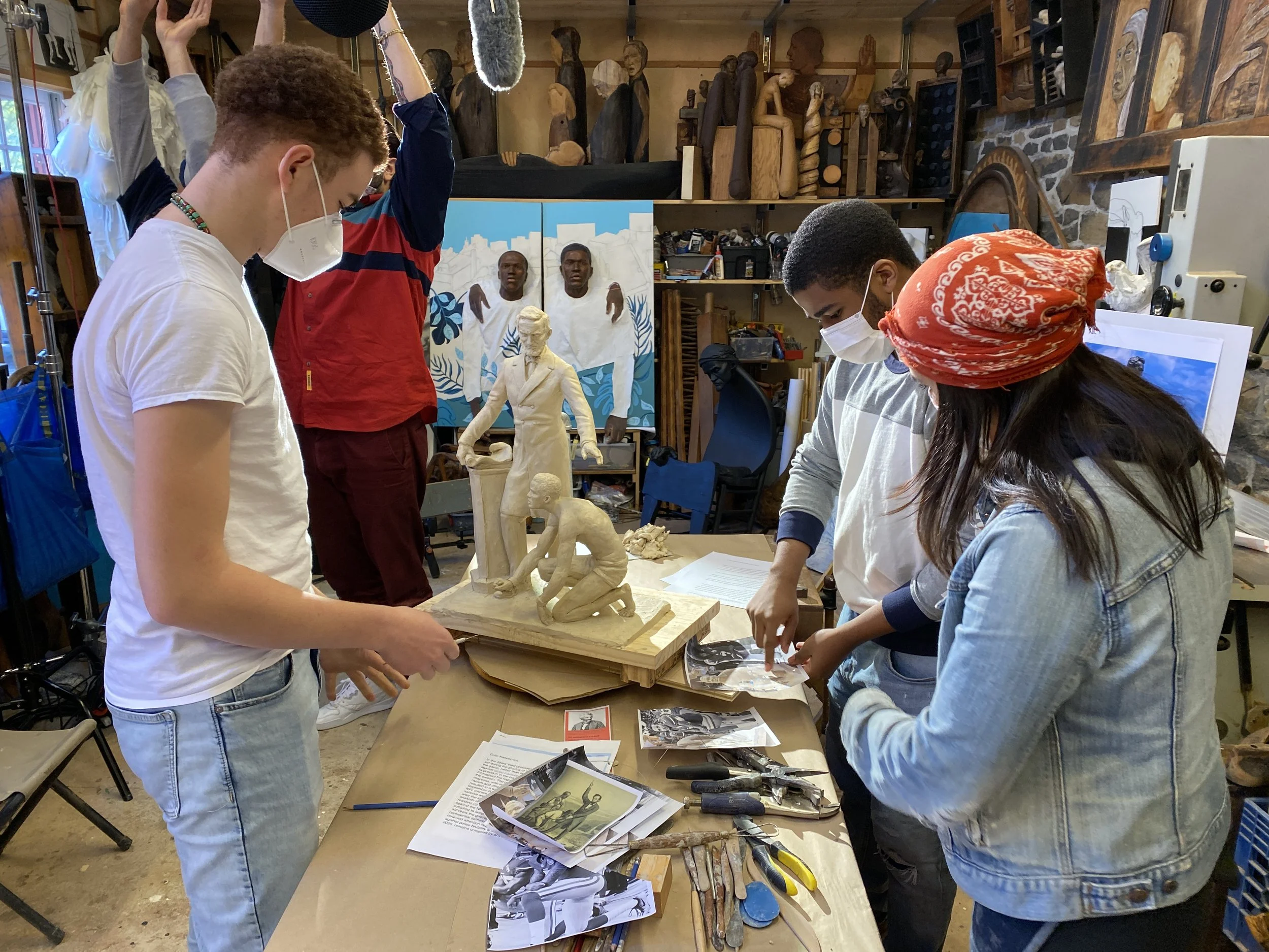 In November 2020, student artists created Emancipation Takes a Knee, a performance piece that reflects on the relationship between historical emancipation and contemporary protest. As they re-sculpt the statue representing the legacy of the Emancipation Proclamation, the work questions how the meaning of freedom continues to evolve.