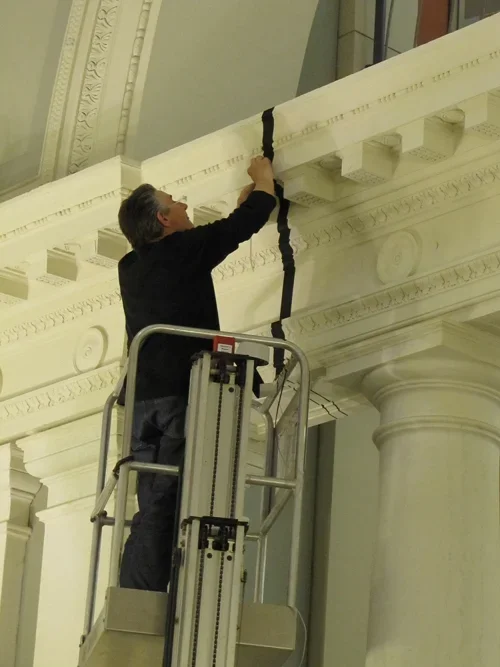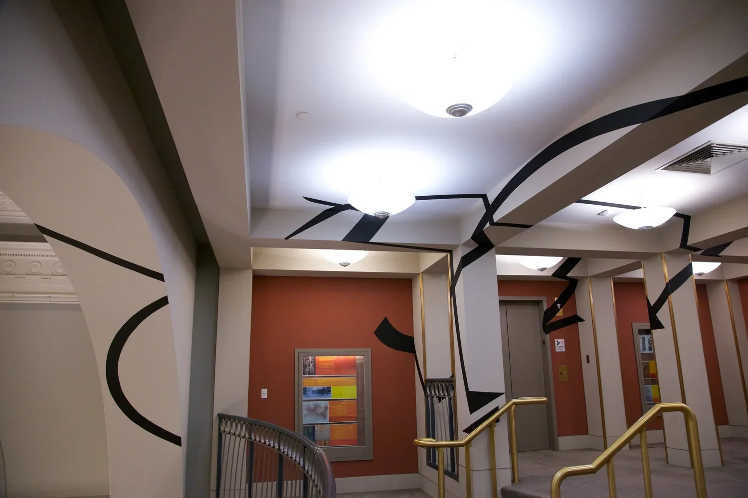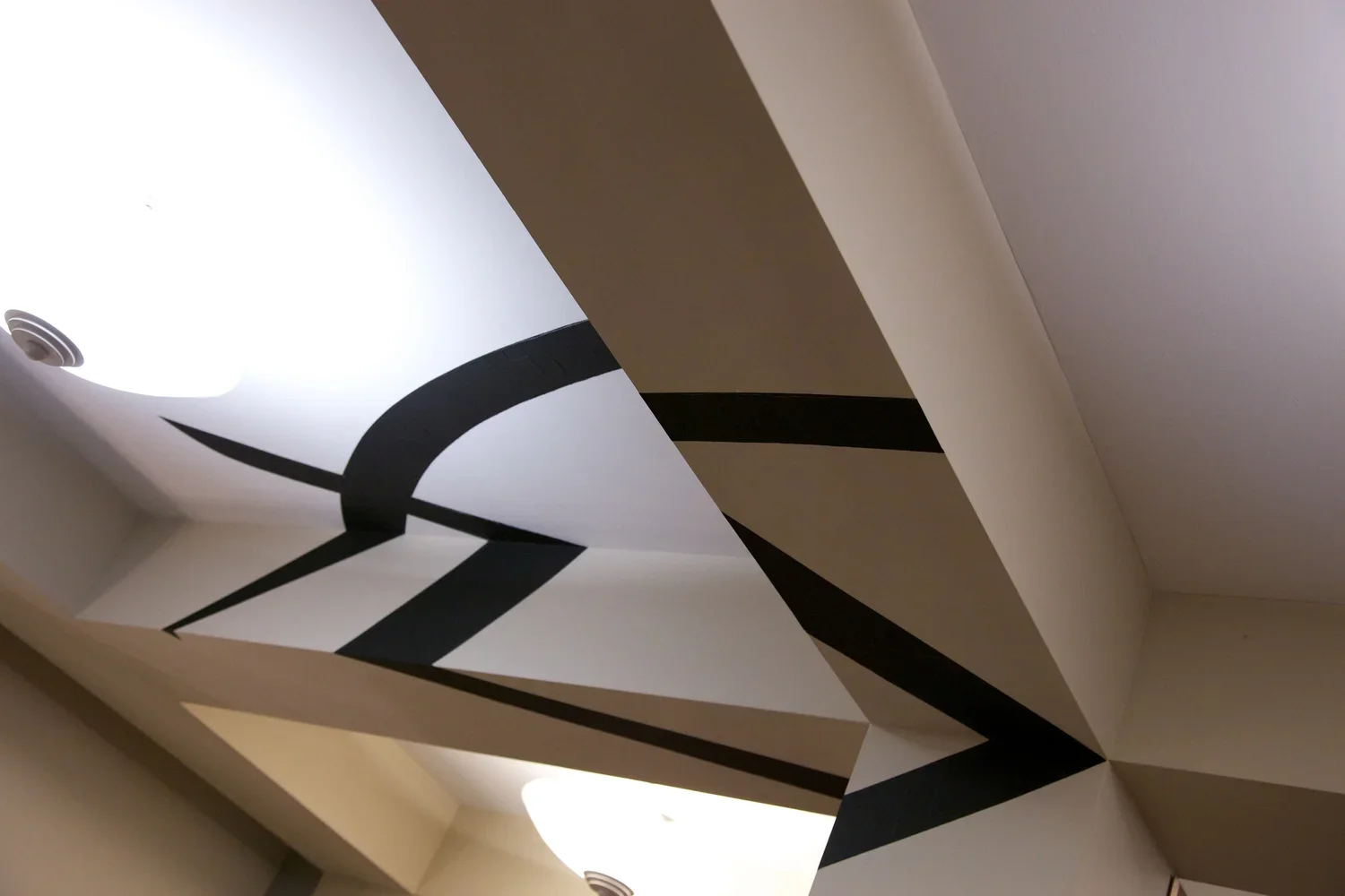Varini’s work plays with concepts of scale, proportion, and perception. While abstract and conceptual, Varini’s three-dimensional wall paintings are also concrete and material. The viewer experiences them from within; as he/she moves through the architectural space which is the canvas, new discoveries are made at every step. Before making a painting, Felice Varini generally roams through the space noting its architecture, materials, history and function. From this spatial data and in reference to the last piece he produced, he designates a specific vantage point for viewing, from which his intervention takes shape.