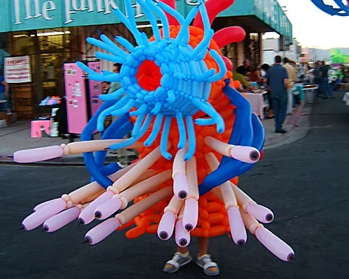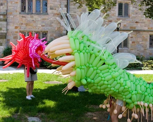 In addition, Hackenwerth created Megamite, a grizzly-bear-sized balloon monster. The artist explains it an anemone, a creature from the deepest reaches of your id. Hackenwerth created Megamite on June 18, 2006 on the New Haven Green as a performance piece during the International Festival. Once the sculpture was complete, the performance continued as Hackenwerth stepped into the piece and wore it around the downtown interacting with hundreds of passers-by. Read the review in the Yale Bulletin here.