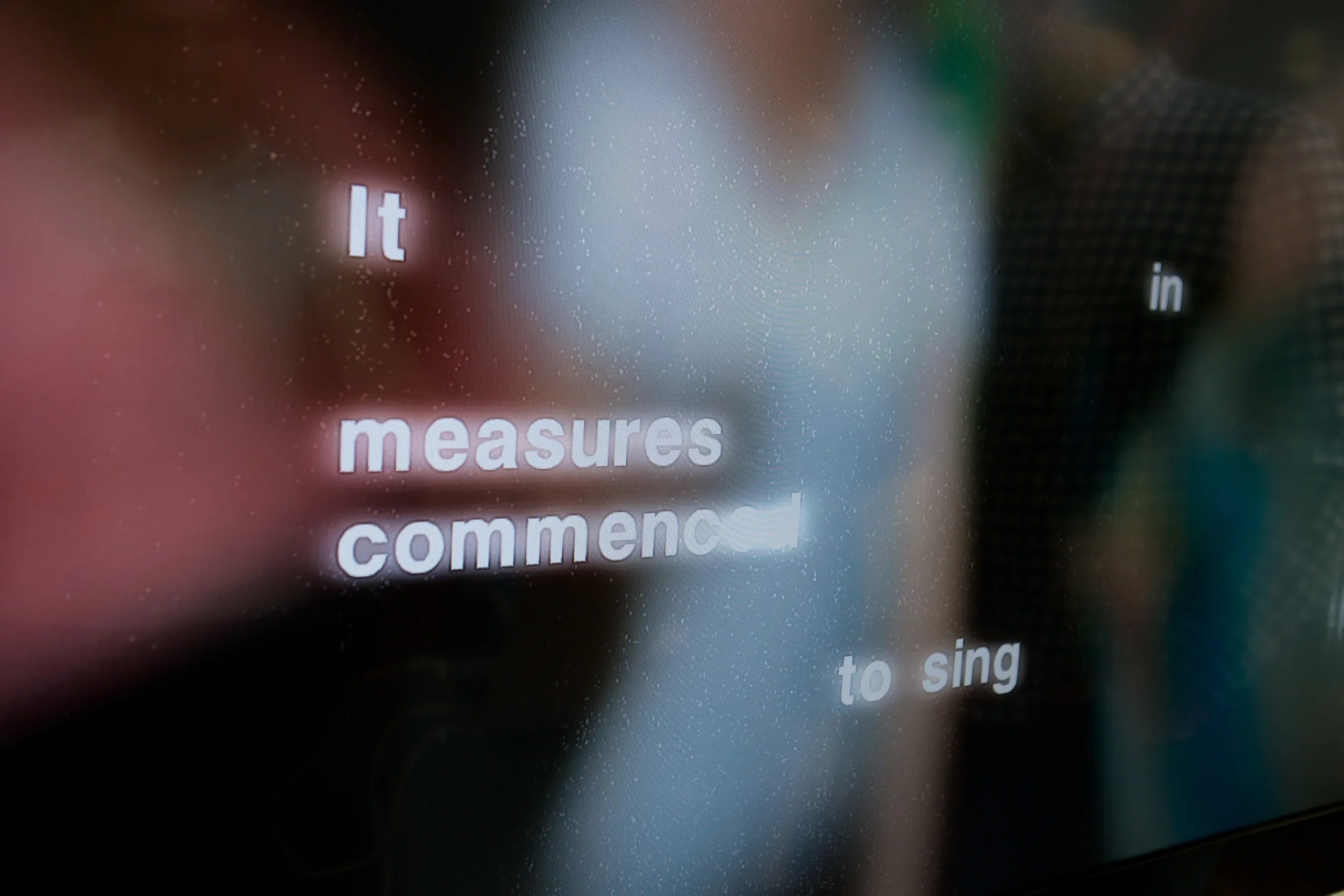 The letters seem to be written in dust or in the sand of time; the words dissolve into particles that follow her fingertip’s gestures. She experiences a tactile delight in flinging the particles across the screen even as she reads the haunting words that are left behind.