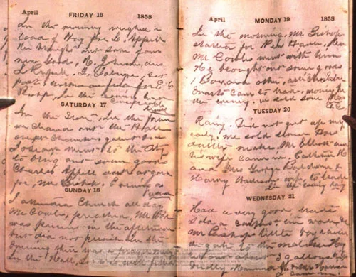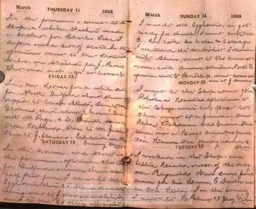 "Whispering Galleries is an interactive artwork that allows visitors to engage with an anonymous diary from the 1850s. The keeper of this diary worked with his hands: as a woodworker making handles for tools, sawing lumber, and sweeping out the shop; as a violinist making music at intimate gatherings and church occasions; and as a composer, writing pieces for performance at the local school. In daily entries, the author’s week is measured out by hand-work.